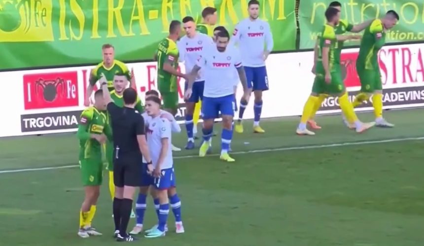 Vatreno je bilo i tijekom utakmice. U 26. minuti, pri vodstvu “Bijelih” od 1:0, uz aut-liniju sukobili su se Mladen Devetak i Emir Sahiti. Krenulo je naguravanje, Erceg se približio, a Livaja ga primio za vrat. Bivše “Hajdučko srce” koje danas nosi pulski dres, držalo se tako za vrat jedno vrijeme, Livaja je dobio žuti i na kraju su se sportski pozdravili.